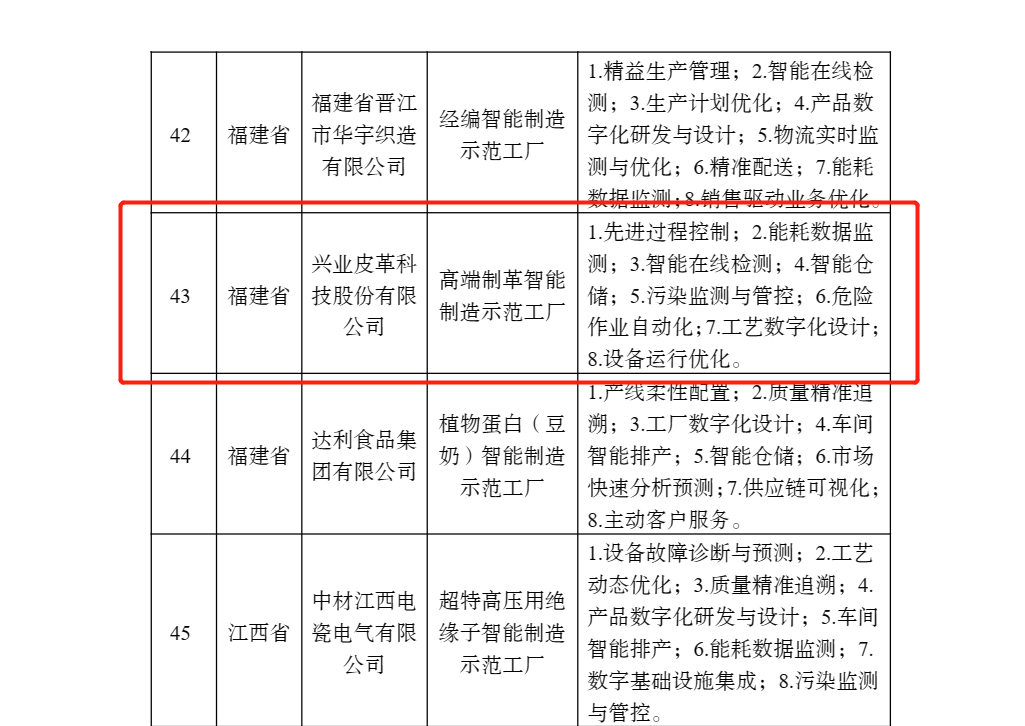 2022年12月30日,工业和信息化部、国家发展和改革委员会、财政部、国家市场监督管理总局发布公告称,为贯彻落实《“十四五”智能制造发展规划》,经省级有关部门推荐、专家评审、网上公示等程序,现将2022年度智能制造示范工厂揭榜单位和优秀场景名单予以公告。其中,皮革行业的兴业科技上榜2022年度智能制造示范工厂揭榜单位。 |