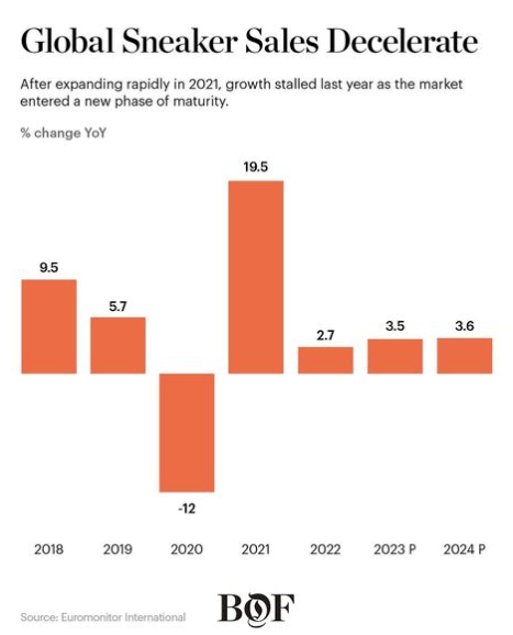 近日,根据 Business of Fashion 公布的最新一份销售报告指出:全球在2022年的球鞋销量增长率有着显著下降,仅有2.7%的增长,但与2021年19.5%的增幅相比大幅放缓。这象征球鞋市场有逐渐陷入低迷的迹象。2.7%与19.5%两个数字相比,不可谓不惨烈。 报告截图 而首当其冲的自然是Nike与adidas两大运动品牌,尽管双方仍然是球鞋市场的领导者,但在2022年各自都面临了库存过剩的危机,Nike和adidas目前的库存总价值分别高达$93亿、$67亿美元,相比同期增加了 43%、73%。同时,在2022年11底,国外知名媒体“商业内幕”传出:Nike、adidas已向制造公司告知将从2023年夏季起将订单量减少30至 40%,目前尚不确定情况将持续至何时,不过业内人士推测,这波趋势可能直至2023年冬季,意味着市面上产品将维持低产量一直到2024年。 减产30%-40%或许稍嫌夸张,但这样结合来看可能并非巧合,至少这两家巨头也感觉到了危机,并且去年积压的库存也会让今年的市场饱和更加严重。而据媒体报道,造成增长放缓的原因有几方面:最主要的原因无疑是大部分消费者“钱包干瘪”。最主要的原因无疑是大部分消费者“钱包干瘪”。这个不用细说大家都懂。其次,在通胀的影响下,运动鞋消费市场也受到严重影响。第三个原因则在于不少运动品牌面临高库存的压力。第四个原因在于品牌商正在加大对转售行为的限制。 另外值得留意的是,除了穆勒鞋和乐福鞋越来越受欢迎之外,中国自家品牌安踏和李宁在国内市场的球鞋占额都在逐年增加,加上ASICS、Mizuno、Merrell、On Running、Salomon等品牌的崛起也是Nike、adidas需注重的事情。 |
