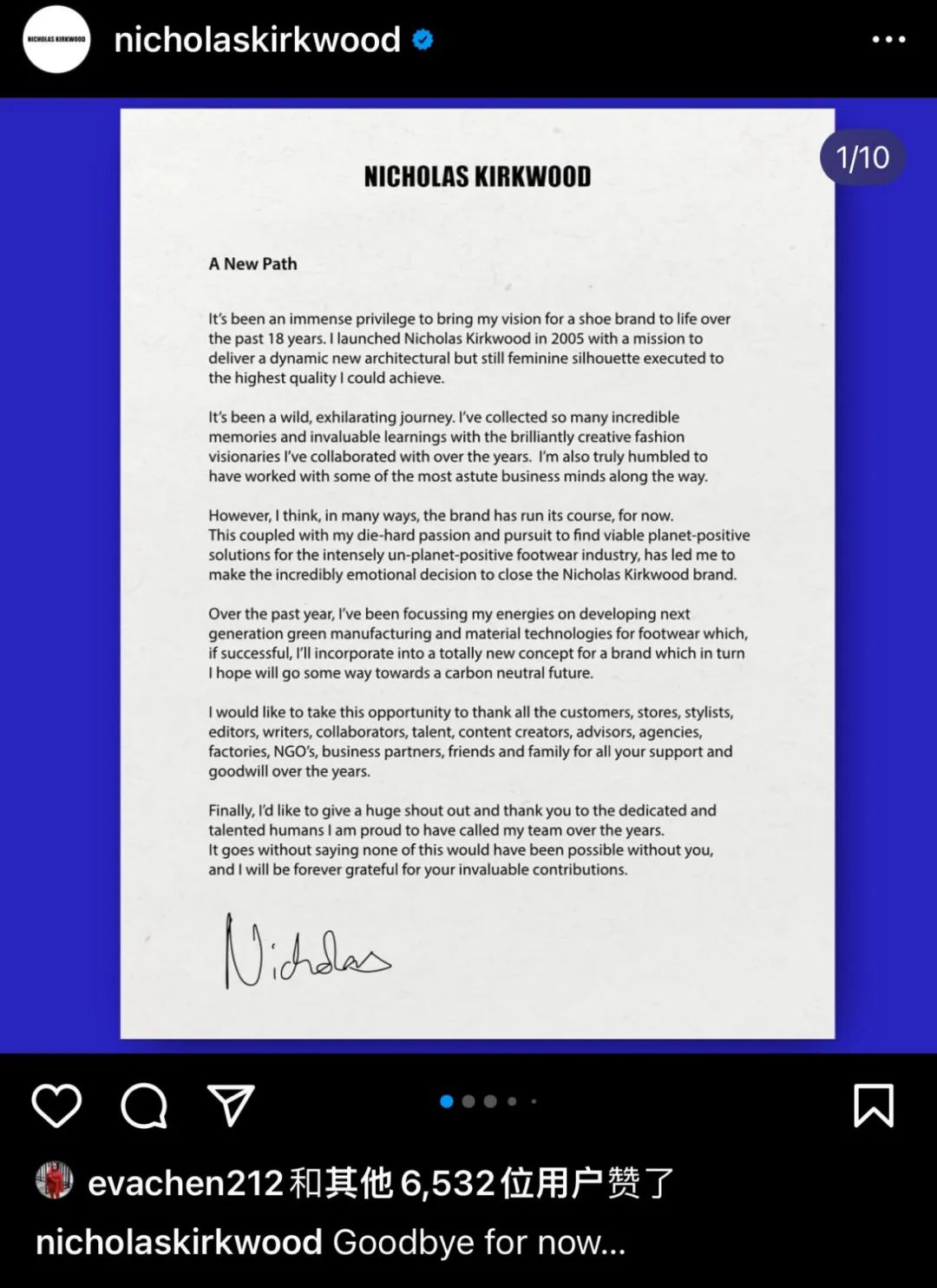 在全球零售环境复苏之际,有鞋履界“米开朗基罗”之称的Nicholas Kirkwood却决定关停个人品牌。2月1日,英国奢侈鞋履品牌Nicholas Kirkwood官方Instagram账号发布声明宣布,在创立18年后,同名创始人最终决定关闭品牌,并删除了此前发布的所有贴文,官网也同步关闭。Nicholas Kirkwood认为,在许多方面其个人品牌已经走到尽头。 图为Nicholas Kirkwood发布的声明 Nicholas Kirkwood毕业于中央圣马丁艺术设计学院,于2005年与Christopher Suarez共同创立同名鞋履品牌,其极具未来主义色彩、摩登的设计风格以及兼顾舒适性的鞋履深受各界名流和皇室人员喜爱,标志性的Casati珍珠系列更是受到消费者的追捧。2008年,Nicholas Kirkwood赢得英国时装协会颁发的年度新人鞋履设计师大奖,后于2013年拿下英国时装协会Vogue Designer Fashion Fund时尚设计师大奖。 Nicholas Kirkwood的迅速走红逐渐引起奢侈品巨头LVMH的注意。2013年,LVMH通过收购Nicholas Kirkwood品牌的多数股份成为大股东,引发广泛关注。 当时有消息人士透露,擅长发掘时尚人才的LVMH首席执行官Bernard Arnault大女儿Delphine Arnault在此项交易幕后发挥了至关重要的作用。在LVMH的主导下,Nicholas Kirkwood在纽约开设了旗舰店,于2014年与日本伊势丹百货达成合作,还与LVMH旗下奢侈品牌宝格丽共同推出手袋。然而随着运动休闲风潮的崛起,运动鞋取代高跟鞋成为人们日常生活的首选,Nicholas Kirkwood市场表现持续不佳,业绩遭遇滑铁卢。Bernstein奢侈品行业分析师Luca Solca直言,Nicholas Kirkwood是LVMH旗下少有且典型的“表现不佳”的品牌。 据英国公司注册局网站发布的数据,Nicholas Kirkwood 2019年营业额为814万英镑,较2018年下降了28%,运营亏损从246万扩大至330万英镑。在疫情的打击下,2020财年该品牌营业额更是腰斩至407万英镑。或许是感受到了市场和集团的压力,Nicholas Kirkwood本人在2020年9月决定与LVMH结束长达7年的合作伙伴关系。LVMH在声明中强调,拆分的决定是双方共同做出的。 有业内人士猜测,从与LVMH解约起,Nicholas Kirkwood就已作出关闭品牌的决定,过去两年是一个缓冲期,存货和人员处理在发布声明前就已安置妥当。不过Nicholas Kirkwood并不打算就此隐退。他在声明中透露,过去一年他一直把精力放在开发新一代环保制造鞋履的技术上,希望能够推出更可持续的品牌,实现碳中和目标。 在此之前,Nicholas Kirkwood也尝试过使用仙人掌、竹子、苹果核等边角料或废弃物开发植物基皮革制作鞋履,“这看上去是个白日梦,但通过技术实现这一目标的可能性非常大“。从消费者角度出发,可持续时尚的鞋履品牌也更符合市场需求。据波士顿咨询公司和法国奢侈品协会Comité Colbert联合发布的《2022年奢侈品展望:作为负责任的先锋前进》报告,奢侈品行业未来的机会来源于生产和资源、产品生命周期、客户关系、责任和全球化五个方面。 调查结果显示,超过66%的消费者认为奢侈品的本质是可持续的,65%的消费者在作出购买决定时会考虑奢侈品公司对可持续发展的承诺。多达80%的受访者认为公司对产品的整个生命周期负有责任,而不仅仅是生产和销售。可以肯定的是,在竞争激烈的奢侈时尚行业,懂得适时放弃,以退为进也是一种选择,Nicholas Kirkwood在等待下一个时机。 |