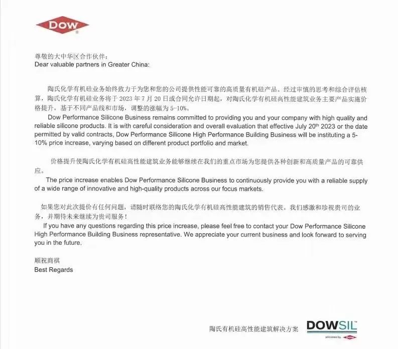陶氏化学近日宣布涨价,公司表示有机硅业务始终致力于为您和您的公司提供性能可靠的高质量有机硅产品。经过审慎的思考和综合评估核算,陶氏化学有机硅业务将于2023年7月20日或合同允许日期起,对陶氏化学有机硅高性能建筑业务主要产品实施价格提升,基于不同产品线和市场,调整的涨幅为5%-10%。 价格提升使陶氏化学有机硅高性能建筑业务能够继续在我们的重点市场为您提供各种创新和高质量产品的可靠供应。如果您对此次提价有任何问题,请随时联络您的陶氏化学有机硅高性能建筑的销售代表。我们感激和珍视贵司的业务,并期待未来继续为贵司服务! |