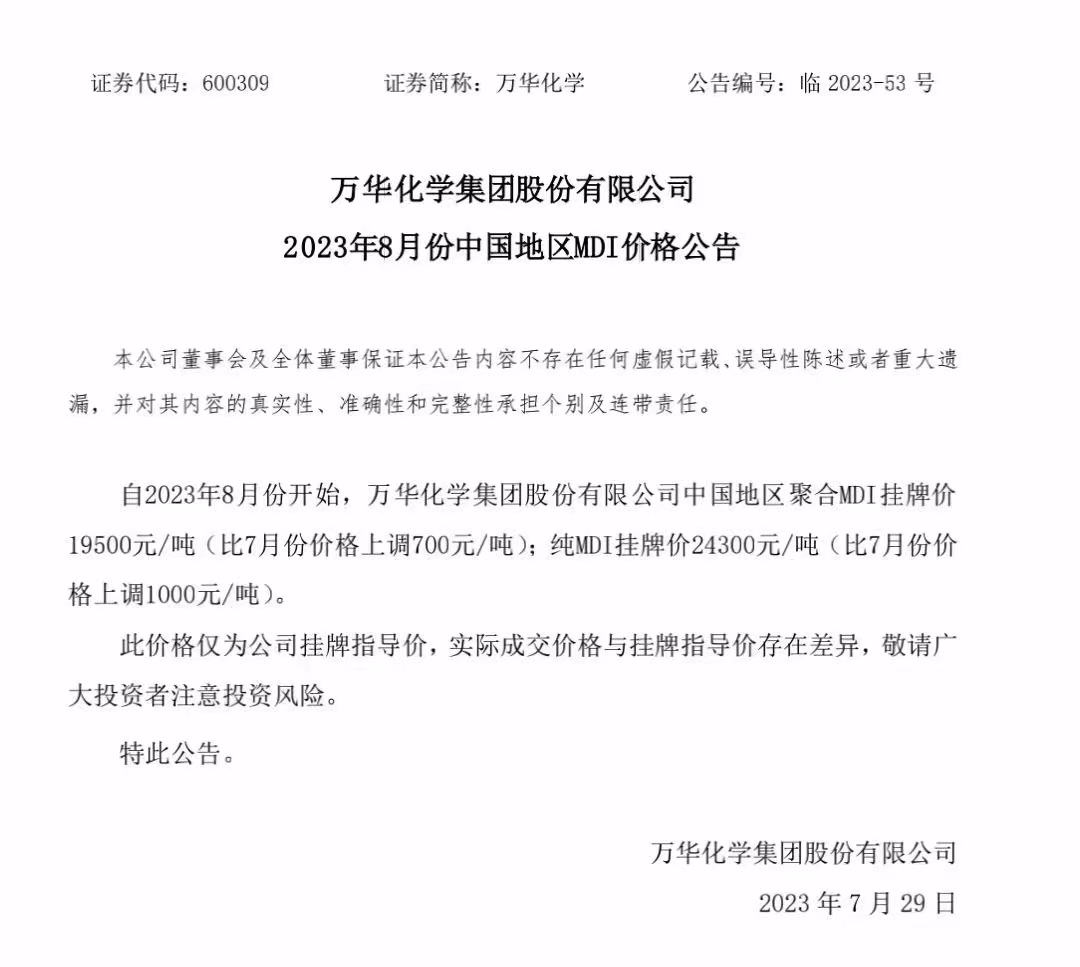 万华化学集团股份有限公司近日发布了2023年8月份中国地区MDI价格公告,中国地区聚合MDI挂牌价19500元/吨(比7月份价格上调700元/吨);纯MDI挂牌价24300元/吨(比7月份价格上调1000元/吨)。 值得一提的是,近期,万华化学披露了中报业绩!从整个公司层面业绩来看的话,没啥亮点,2023年上半年实现营业收入876.26亿元,同比下降1.67%;归母净利85.68亿元,同比下降17.48%。 尤其石化板块业务巨惨,营收利润双双大降,净利润同比大跌:2023年上半年报告期内实现营业收入1,176,365万元,净利润745万元;2022年上半年实现营业收入 2,197,196 万元,净利润 25,085万元。但聚氨酯板块值得关注。聚氨酯板块的整个上半年的毛利是29.12%,去年全年是24.45%,而新材料板块都由去年27.63%的毛利降到22.05%,赚钱还得是聚氨酯,甚至可以说掌握了定价权后,聚氨酯板块确实可以堪称为万华的定海神针! 据了解,MDI是生产聚氨酯最重要的原料。聚氨酯广泛应用于家居领域,是生产海绵、记忆棉、泡沫塑料,仿木材料、胶粘剂等材料的主要原料。而万华化学是亚太地区最大的MDI制造企业,是家居建材企业,尤其是软体家具企业的主要上游供应商。万华化学被业内冠以“化工茅”称号,其MDI在国内市场具有极强的议价能力。 从量和价方面来看,量上面124万吨,同比增长10.71%,环比增长11.71%,能产就能卖,价上面二季度MDI虽然跟随原材料价格略有下降,但整体降幅相对较小,聚合MDI 价格仅环比下降了2.54%,纯MDI价格环比下降了0.96%。 半年报中万华对于聚氨酯板块的表述:上半年全球聚氨酯市场需求同比基本持平,环比处于回升态势;受欧美需求放缓、 国内房地产不景气等因素影响,全球聚氨酯需求整体处于恢复之中。 |