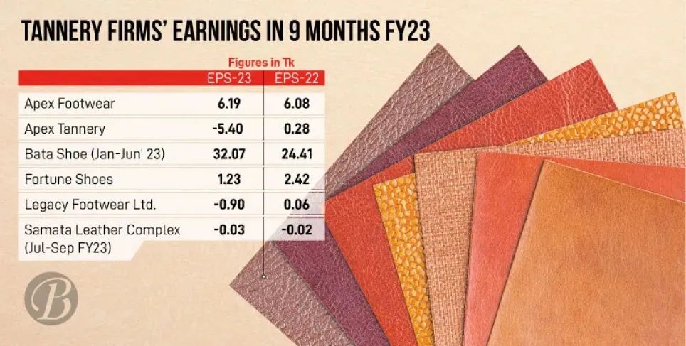 据媒体近日报道,在达卡证券交易所上市的6家制革企业中,有一家企业在2022-2023财年的前9个月(7月至3月)实现收入增长。另有一家在2023年的前6个月(1月至6月)实现了利润大幅增长。根据达卡证券交易所(DSE)提供的数据显示,在其余四家公司中,有一家企业的收益下降,而其余三家公司在2023财年的7月至3月期间陷入亏损。这6家上市的制革企业分别是Ape、Apex、Bata(孟加拉国)、Fortune、Legacy和Samata制革厂。 Apex公司秘书奥马尔·法鲁克对《商业邮报》称:“2023财年的9个月,公司在当地销售额有所增长,生产成本的降低有助于我们在前9个月的生产正常运营。但由于原材料价 格上涨、本币贬值以及产量增加,今年1季度,我们的收益同比下降近60%。” Apex是一家以出口为导向的制革企业,据该公司报告称,2023财年其9个月,公司收益下降了180%。Apex公司表示,收益大幅下跌主要原因是销售额下降、化学品成本增加、管理费用和额外的促销费用不断增加。然而,Bata (孟加拉国)却在2023年上半年(1月至6月)取得31.37%的净利润增长,以及收入的大幅增长。同期,Fortune的税后利润为2.099亿塔卡,而去年同期为4.1亿塔卡。其余两家Legancy和Samata均出现大幅亏损。 |
