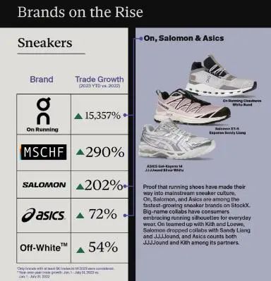 近日,美国运动鞋交易平台StockX发布了2023年运动品牌最新趋势报告《Big Facts》。报告通过对比2023年1月至7月与2022年同期的全球贸易数据。运动鞋榜单中,跑鞋是StockX平台交易量增长最快的品类之一。 今年1月-7月,StockX运动鞋交易量增长最快的前五个品牌,分别是:On昂跑、MSCHF、Salomon萨洛蒙、亚瑟士、Off-White,其中On昂跑、萨洛蒙、亚瑟士均是运动品牌,On昂跑的跑鞋交易量更是在7个月里狂涨153倍。 《Big Facts》报告中显示,今年前7个月,On昂跑交易量增长15357%;萨洛蒙交易量增长202%;Asics的交易量则增长72%。随着跑步者品牌重塑,On昂跑、萨洛蒙和亚瑟士人气飙升,这证明跑鞋已进入主流运动鞋文化。 |