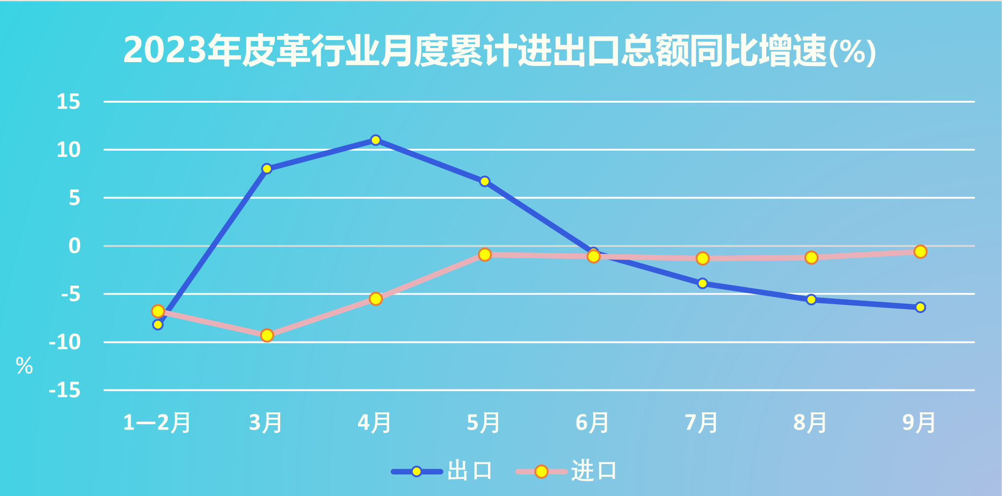 2023年1-9月,全国皮革行业产品出口总额总计733.6亿美元,同比下降6.4%,占全国出口总额的2.9%;进口总额总计131.8亿美元,同比下降0.6%,占全国进口总额的0.7%。 2023年1-9月,全国皮革行业产品进出口贸易顺差601.8亿美元,同比下降7.6%,占全国进出口贸易顺差总额的9.6%。 |