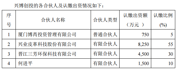 兴业科技近日召开了第六届董事会第六次会议,审议通过《关于公司参与投资设立创业投资基金的议案》,同意公司参与投资设立厦门兴博创业投资合伙企业(有限合伙)(暂定名,以市场监督管理部门最终核准登记为准)。 兴博创投总认缴出资额为人民币15,000万元,其中厦门博芮投资管理有限公司为普通合伙人,认缴5%的份额,认缴出资额为750万元,并担任执行事务合伙人。公司为有限合伙人,拟以自有资金出资认缴 55%的份额,认缴出资额为8,250万元;晋江三芳环保科技有限公司为有限合伙人,认缴30%的份额,认缴出资额为 4,500万元;何进平为有限合伙人,认缴10%的份额,认缴出资额为1,500 万元。 该创投基金采用通行的有限合伙制模式来管理和经营,厦门博芮投资管理有限公司作为创投基金的管理人受托执行基金的资产管理业务,有限合伙人不执行合伙人事务,不得对外代表创投基金。 兴业科技方面表示,本次对外投资,有利于公司借助专业投资机构的专业团队、项目资源和平台优势,整合利用各方优势资源,进一步拓宽投资渠道,挖掘优质标的企业,利于公司长远发展,提升竞争实力。公司本次参与投资设立兴博创投,不会影响公司正常的生产经营活动,不存在损害中小股东利益的情形。 |