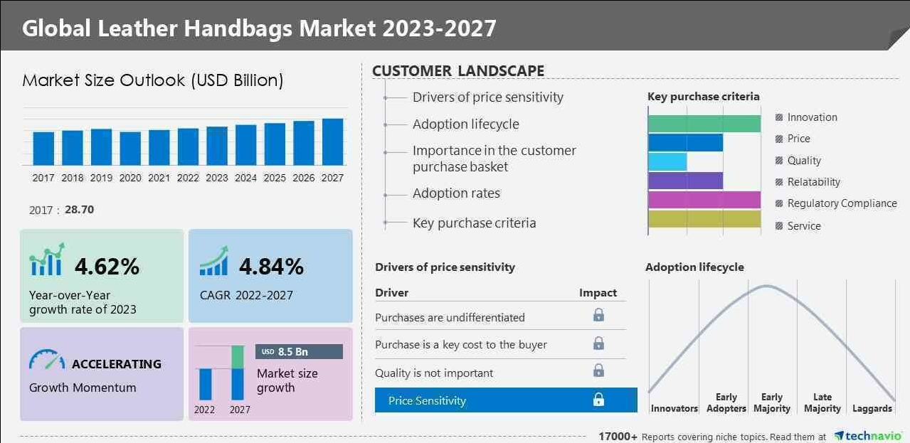 从2023年到2027年,全球皮革手袋市场规模预计将增长85亿美元。预计该市场在预测期内将以4.84%的复合年增长率增长。 2022年,亚太地区占据全球市场最大份额,预计该地区市场将增长32%。 预计亚太地区将在推动全球皮革手袋市场方面发挥关键作用 地理景观 在时尚意识不断增强以及对优质奢侈品的需求不断增长的推动下,亚太地区皮革手袋市场正在经历强劲增长。产品组合包括传统手袋、经济实惠的皮革手袋和定制选择。产品改进、技术创新和品牌认知度是推动市场扩张的关键因素。包括电子商务公司和初创公司在内的社交平台和分销渠道正在改变销售策略。然而,对动物屠宰和贸易法规的担忧可能会影响该行业。生产分析、价值链优化和新兴收入口袋提供了增长机会。手提袋和职业女性配饰等应用领域越来越受欢迎。产品的批准和发布,以及消费者对设计师作品、质量、工艺和寿命的偏好,继续影响着市场趋势。皮革手袋市场占据主导地位,但织物手袋市场也在增长。线上线下分销渠道满足多样化的消费者需求。皮革手袋的客户群体基数庞大,技术在提升消费者体验方面发挥着至关重要的作用。女性劳动力队伍的加入和时尚宣言进一步刺激了需求。 研究分析 在快速全球化的背景下,年轻人的皮革手袋市场正在经历显着增长。消费者对高品质皮革手袋作为时尚配饰的消费反映了他们的生活方式和消费行为。女性不断加入到劳动力队伍导致对适合她们职业需求的耐用且持久的带隔层手袋的需求增加。综合调查显示,由于皮革手袋的耐用性和投资价值,美国女性更喜欢皮革手袋而不是织物手袋。该领域对皮革材料(例如生皮和加工皮革)的需求量很大。手工制作的皮革配饰强调高品质工艺和设计师作品,是流行的时尚宣言。皮革手袋细分市场和织物手袋细分市场是不同的市场,前者专注于奢侈品和投资,而后者迎合更休闲和实惠的消费者偏好。在线分销渠道对于接触消费者越来越重要,尤其是那些重视便利性和多样性的消费者。总之,皮革手袋市场是由消费者对耐用性、寿命和投资价值的偏好以及对高品质、时尚配饰的渴望推动的。 市场驱动因素 由于时尚意识以及对定制和个性化产品的需求,皮革手袋市场正在显着增长。奢侈品领域的领先市场参与者正在通过定制皮革手袋,融入贵金属、宝石和个性化装饰来增强其产品组合。传统手袋正在通过价格实惠的皮革选项进行重新设计,以满足更广泛的消费者群体。产品改进和技术创新是重点关注领域,社交平台和电子商务公司推动销售。初创公司正在通过手工制作的配件和利基应用领域扰乱市场。品牌认知度和价值链优化对于市场成功至关重要。原材料价格、贸易法规和生产分析是影响市场的关键因素。新兴的收入来源包括职业女性和手提包领域。消费者对时尚宣言、质量、工艺和寿命的偏好继续推动需求。对于奢侈品消费者来说,杀害动物仍然是一个有争议的问题。产品批准、发布和应用主导地位正在塑造市场格局。 市场概况 皮革手袋市场是全球时尚业的重要组成部分。消费者更喜欢皮革手袋,因为它们耐用、时尚且多功能。生产过程涉及多个阶段,包括鞣制、切割、缝合和组装。使用的原材料主要是牛皮、绵羊皮和山羊皮。该市场受到可支配收入增加、城市化进程加快和消费者偏好变化等因素的推动。 Ralph、Comfortable 和 Fashionable 等品牌提供各种皮革手袋,迎合不同的预算和风格。消费者对道德和可持续生产实践的意识也越来越强,导致对环保皮革手袋的需求增加。预计该市场在未来几年将稳步增长,其中亚太地区因其人口众多和经济增长而成为主要贡献者。 |