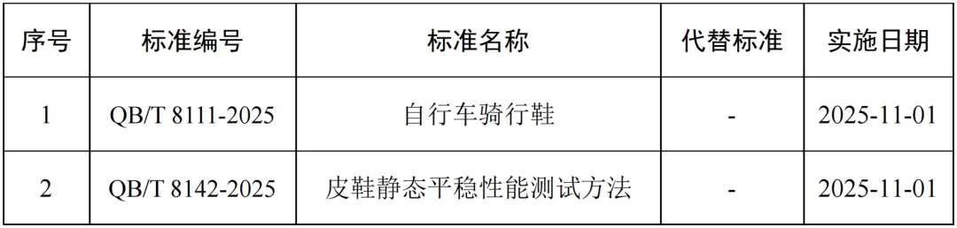 近日,工业和信息化部发布2025年第7号公告,批准发布了1128项行业标准。其中,全国制鞋标准化技术委员会及其下属皮鞋分技术委员会分别归口管理的《自行车骑行鞋》、《皮鞋静态平稳性能测试方法》制鞋行业标准获批发布,具体如下表所示。 此次新发布的行业标准《自行车骑行鞋》规定了自行车骑行鞋的标识、感官质量、物理机械性能、宣称的性能等要求,描述了相应的试验方法,规定了结果判定、检验规则、包装、运输、贮存的内容,同时给出了款式设计的建议以及便于技术规定的产品分类。《皮鞋静态平稳性能测试方法》描述了皮鞋静态平稳性能的测试方法,包括原理、设备和材料、试样和环境调节、试验方法、试验结果和试验报告。两项标准均将于2025年11月1日实施。 |